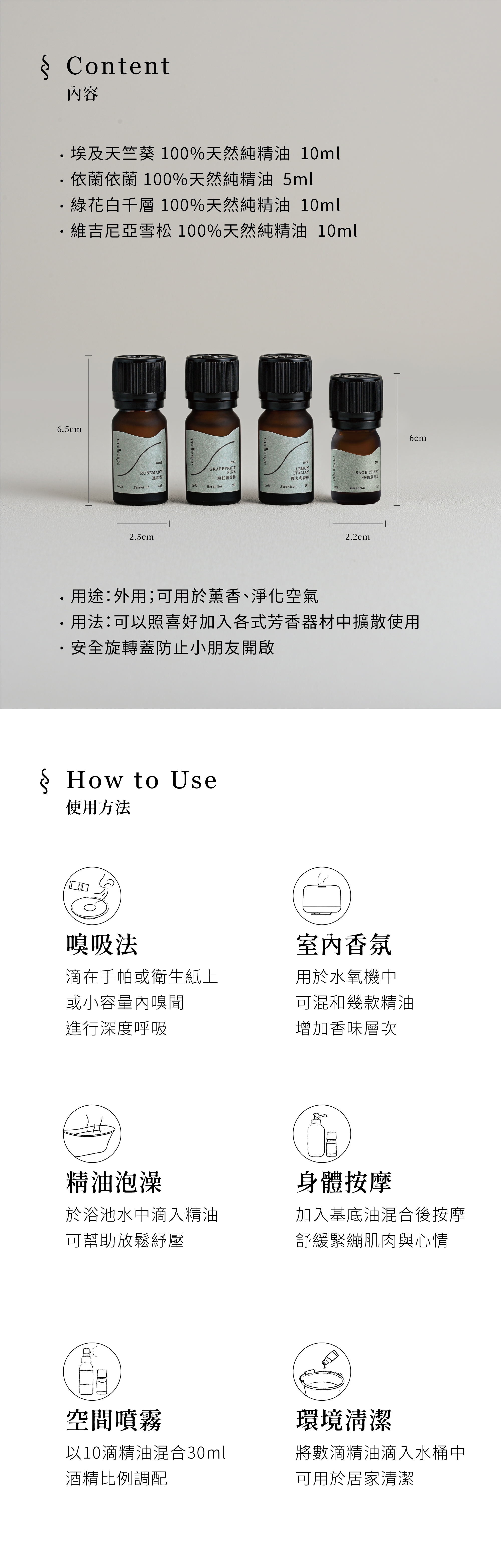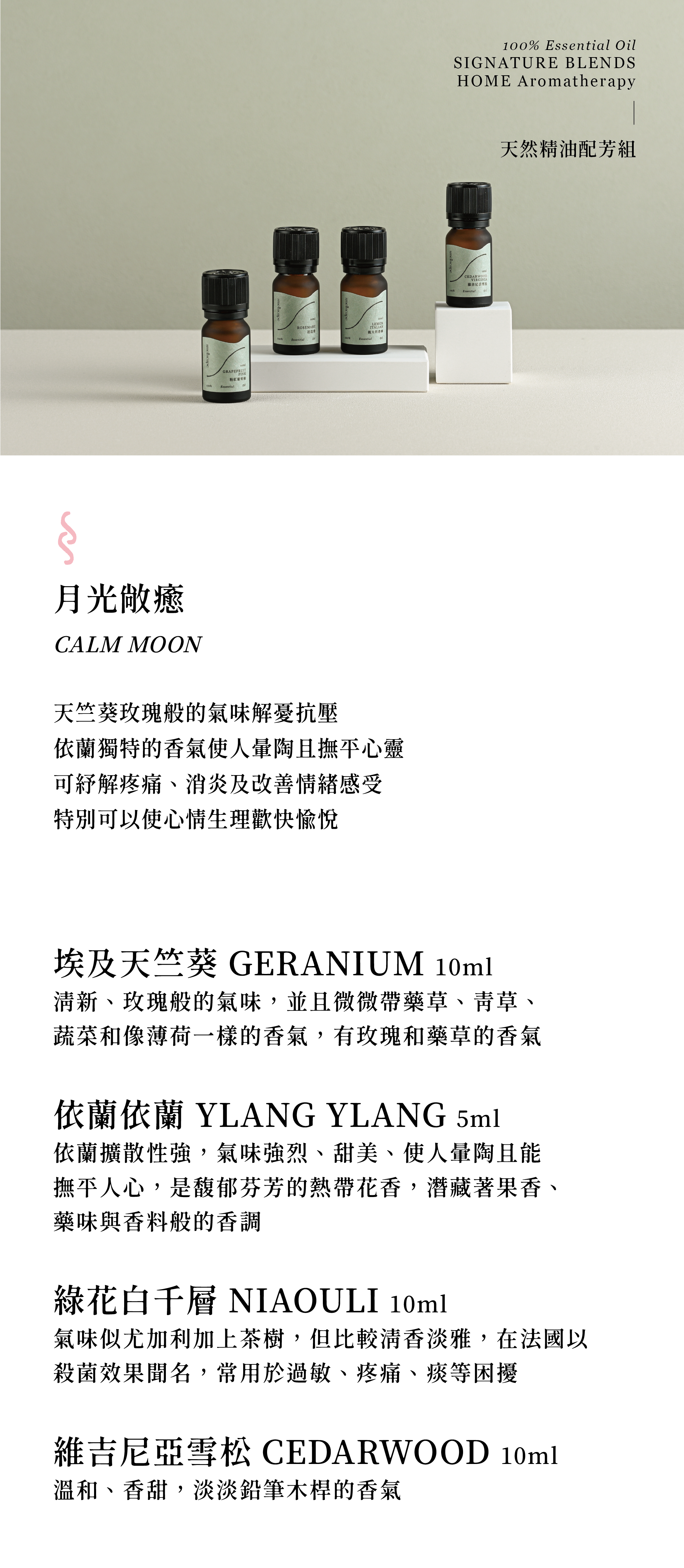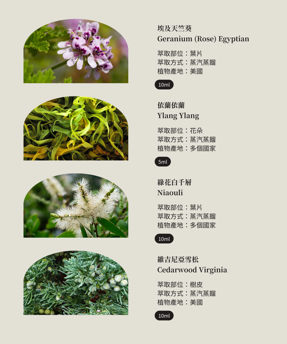 天竺葵玫瑰般的氣味解憂抗壓,依蘭獨特的香氣使人暈陶且撫平心靈,細細享受香氣改善情緒感受,使心情生理歡快愉悅。