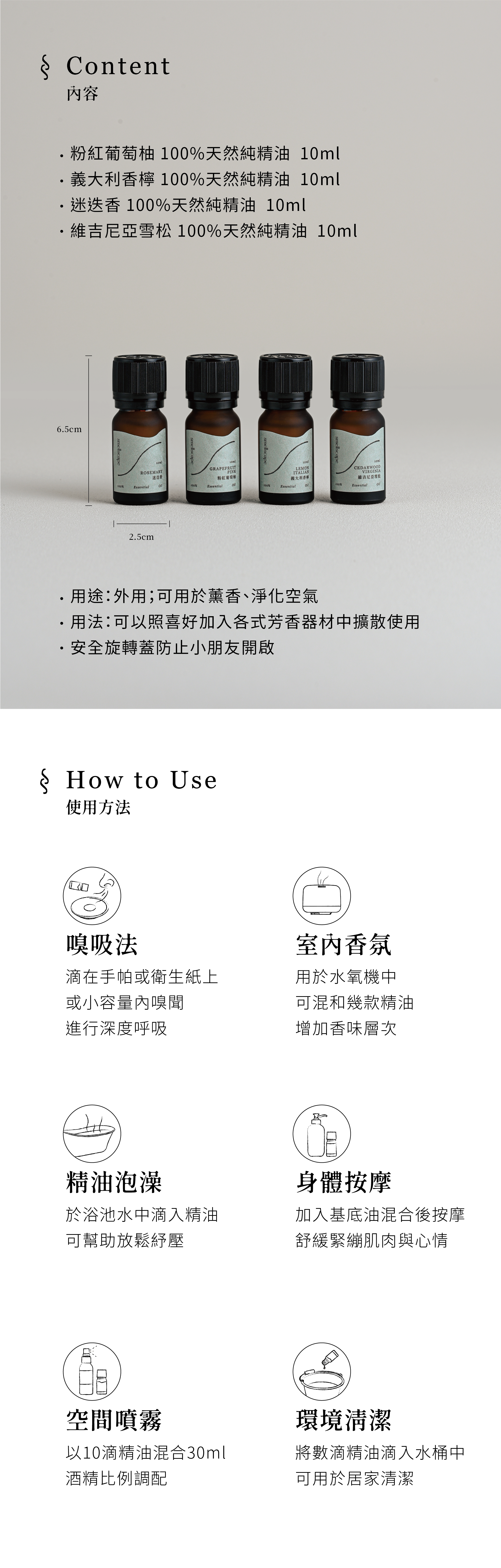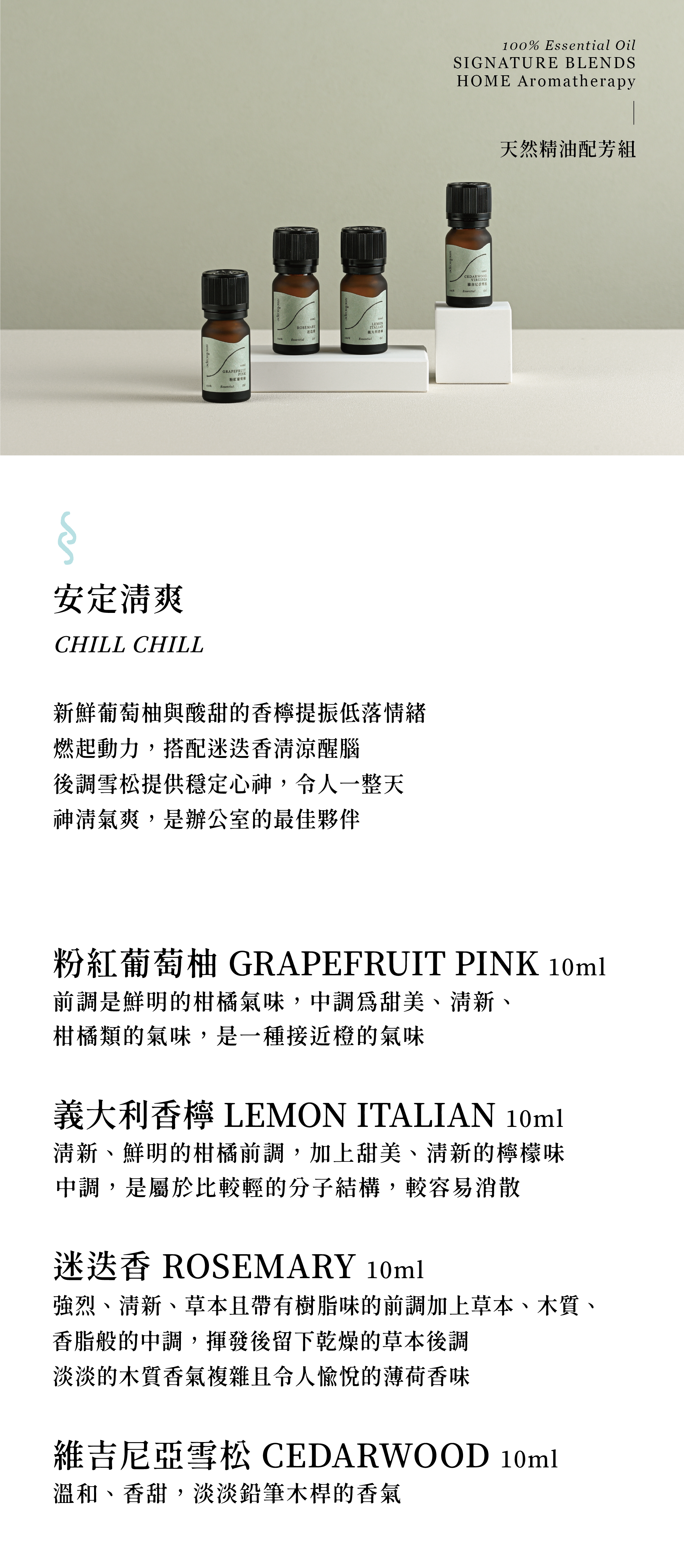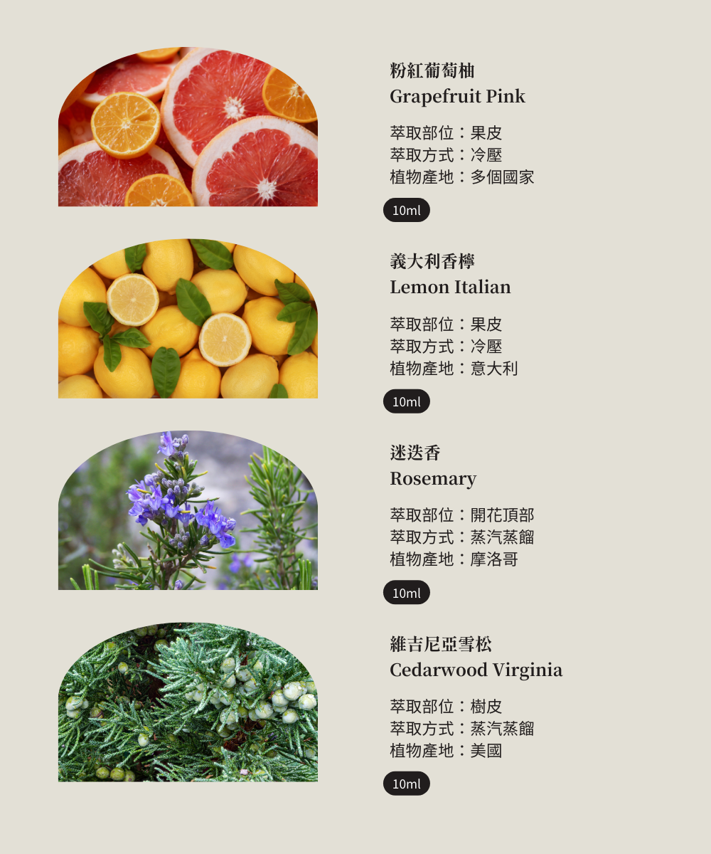 新鮮葡萄柚與酸甜香檸提振低落情緒、燃起動力,搭配迷迭香清涼醒腦後調雪松提供穩定心神,令人一整天神清氣爽是辦公室最佳夥伴。