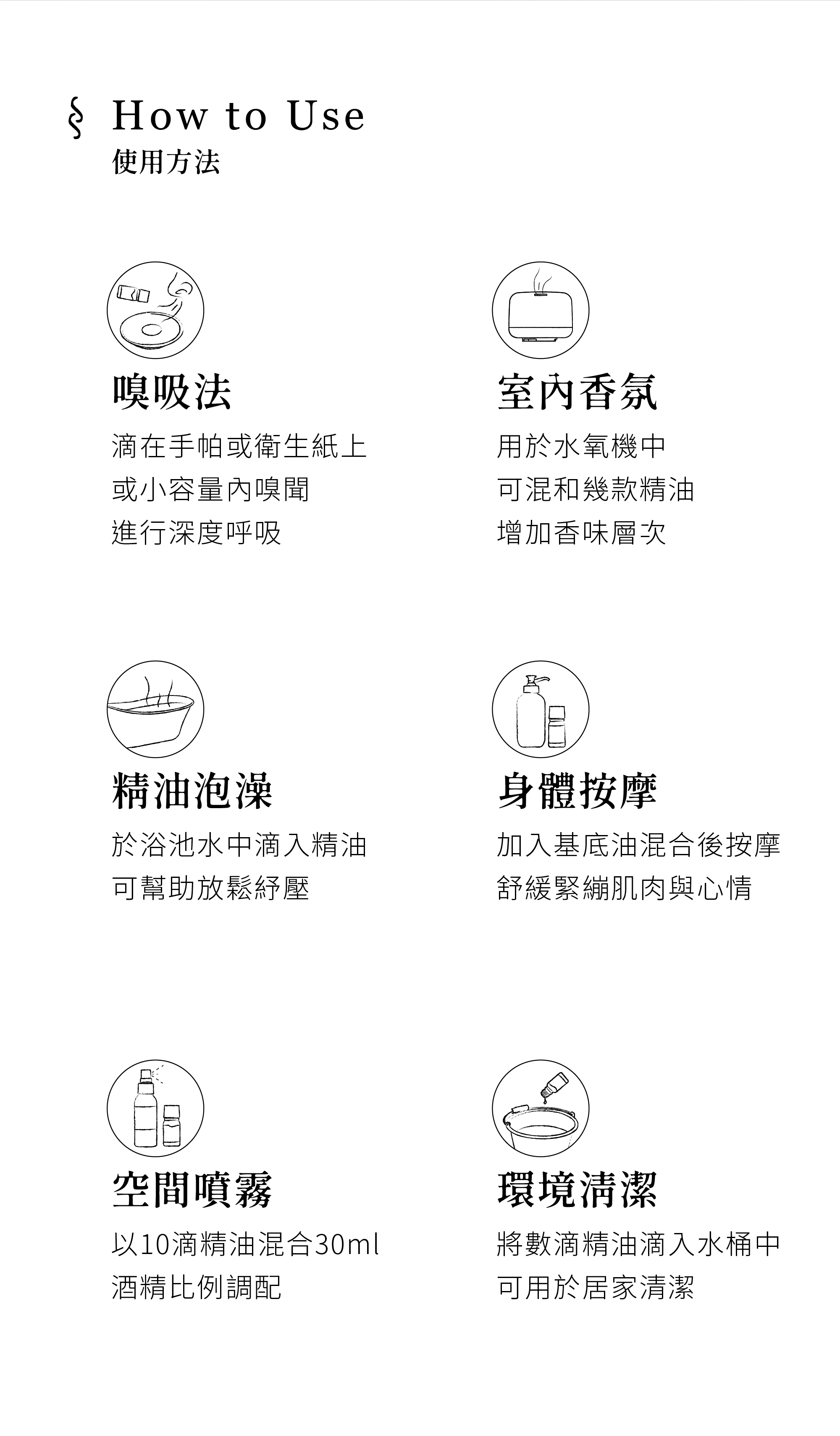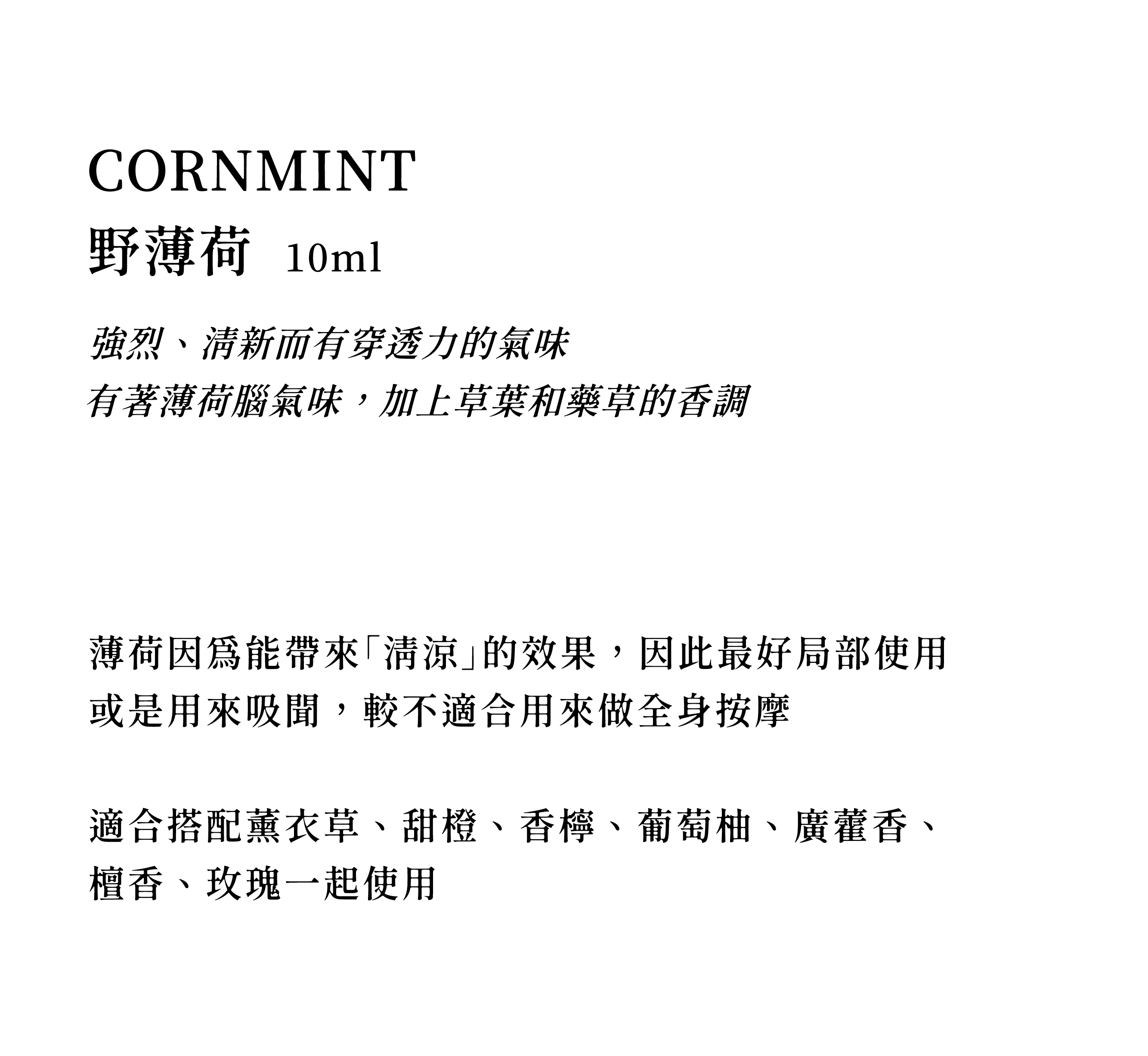 強烈、清新而有穿透力的氣味,有著薄荷腦氣味,加上草葉和藥草的香調。適合局部使用,或是用來吸聞。