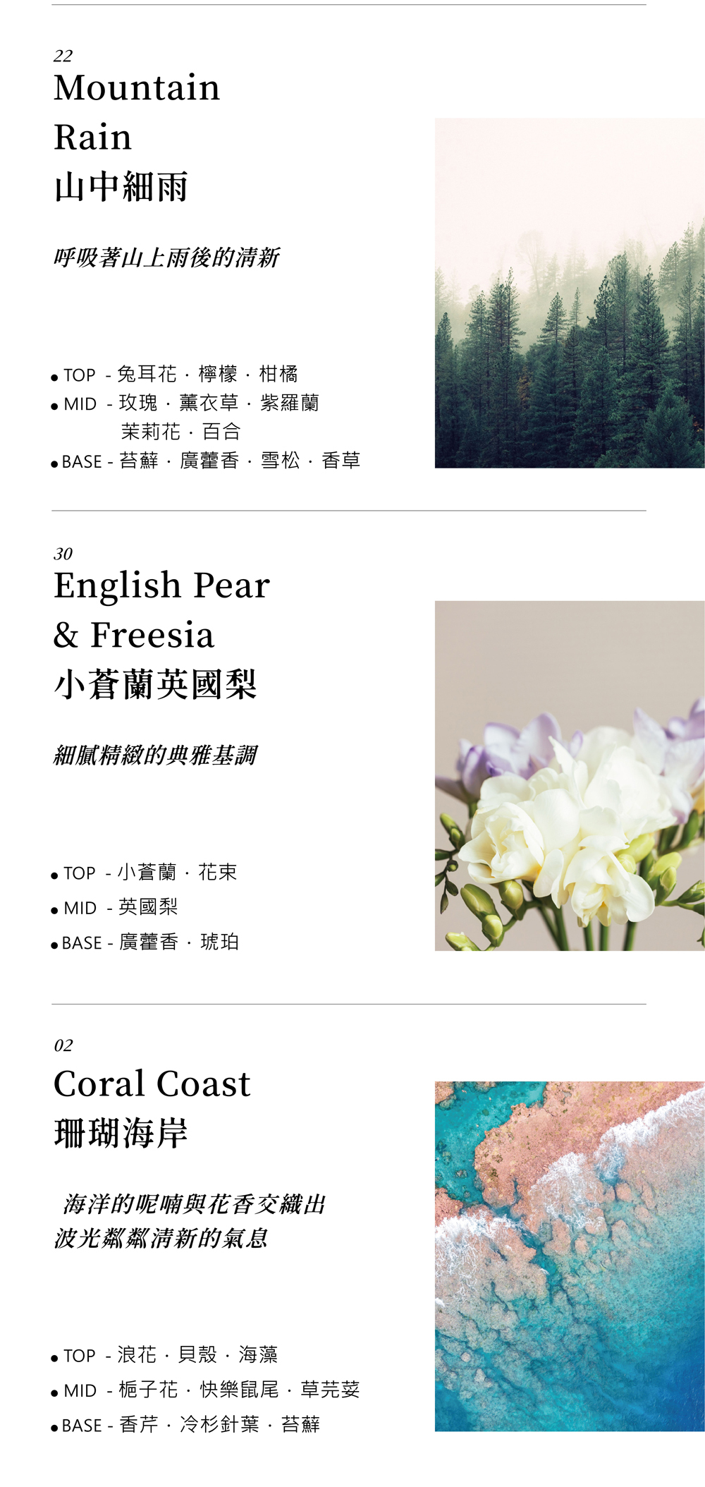 山中細雨、白廣藿香、初霽綠茶、小蒼蘭英國梨、珊瑚海岸