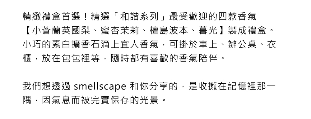 精選最受歡迎的四款香氣 【 小蒼蘭英國梨、暮光、檀島波本、蜜杏茉莉 】製成限定禮盒。