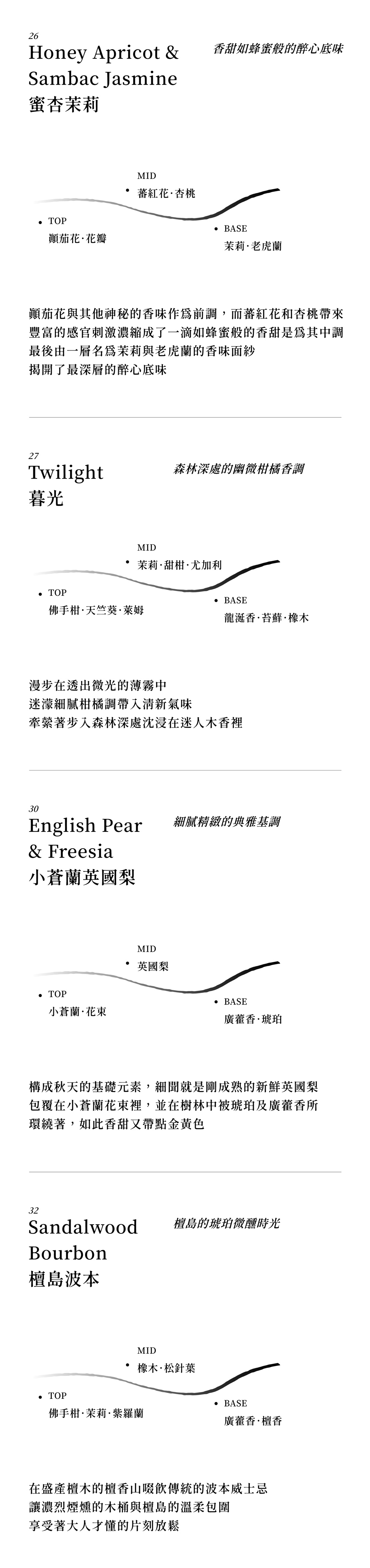 精選最受歡迎的四款香氣 【 小蒼蘭英國梨、蜜杏茉莉、檀島波本、暮光 】製成限定禮盒。