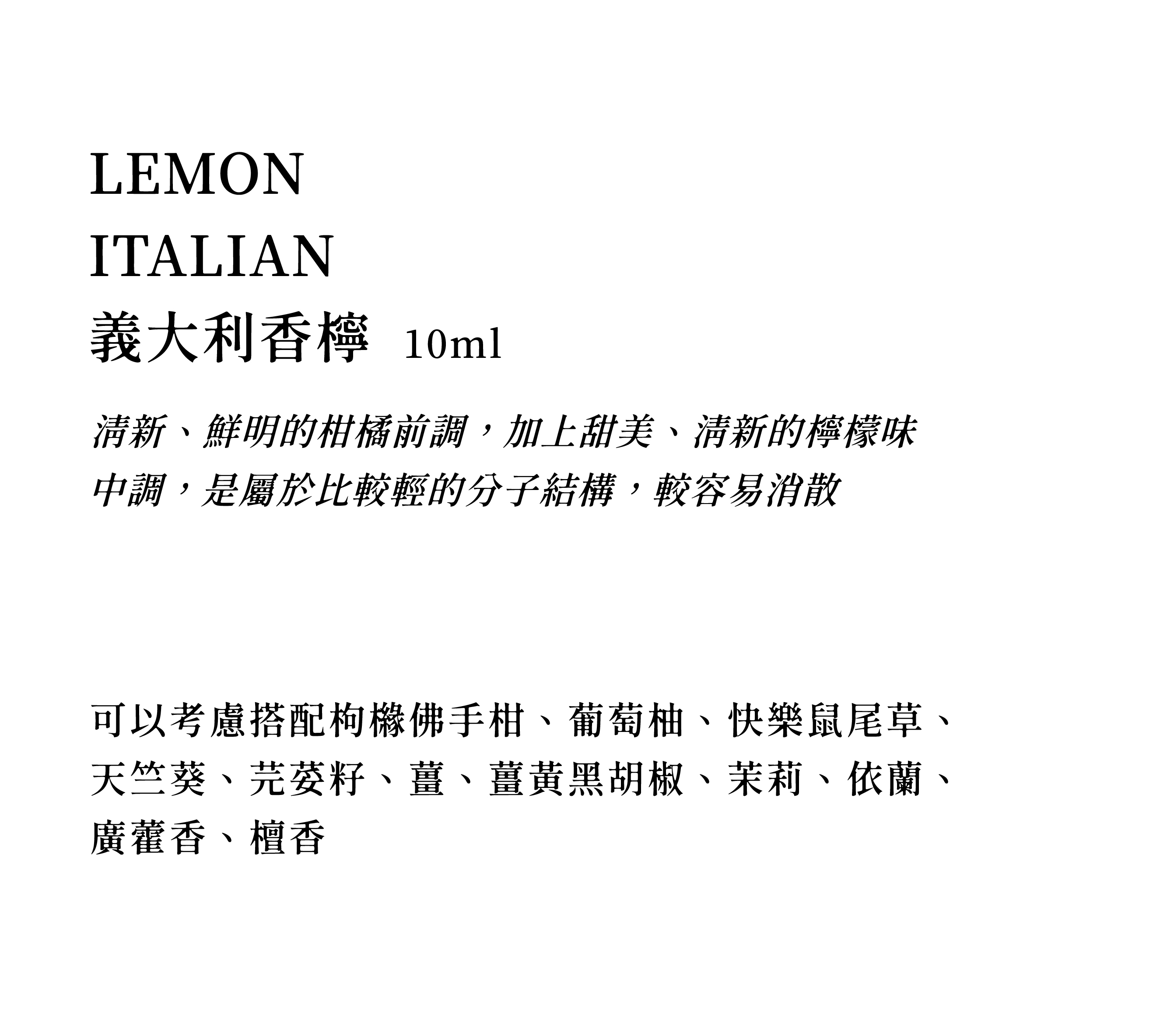 清新、鮮明的柑橘前調,加上甜美、清新的檸檬味中調,是屬於比較輕的分子結構,較容易消散。