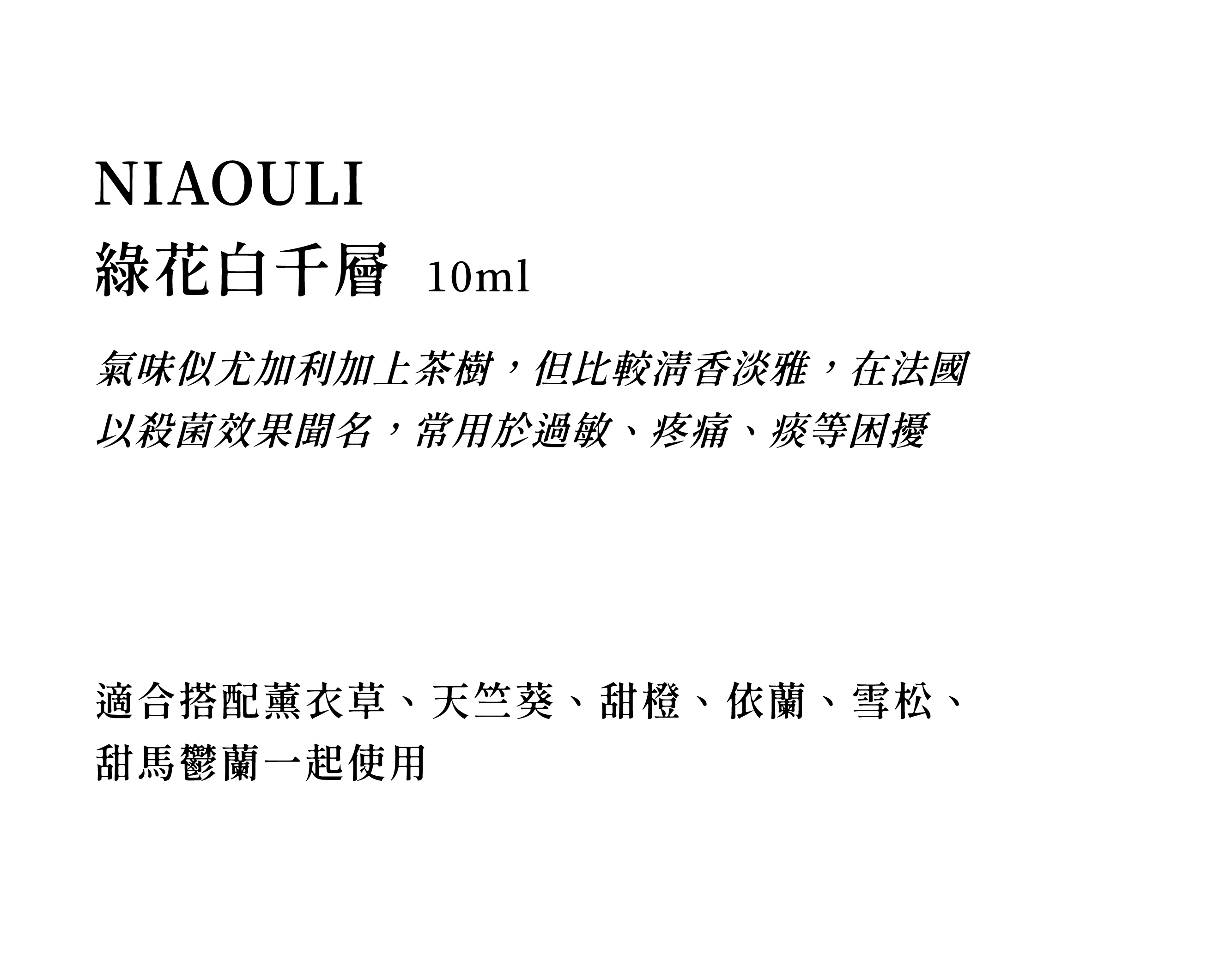 氣味似尤加利加上茶樹,但比較清香淡雅,在法國以殺菌效果聞名,常用於過敏、疼痛、痰等困擾。