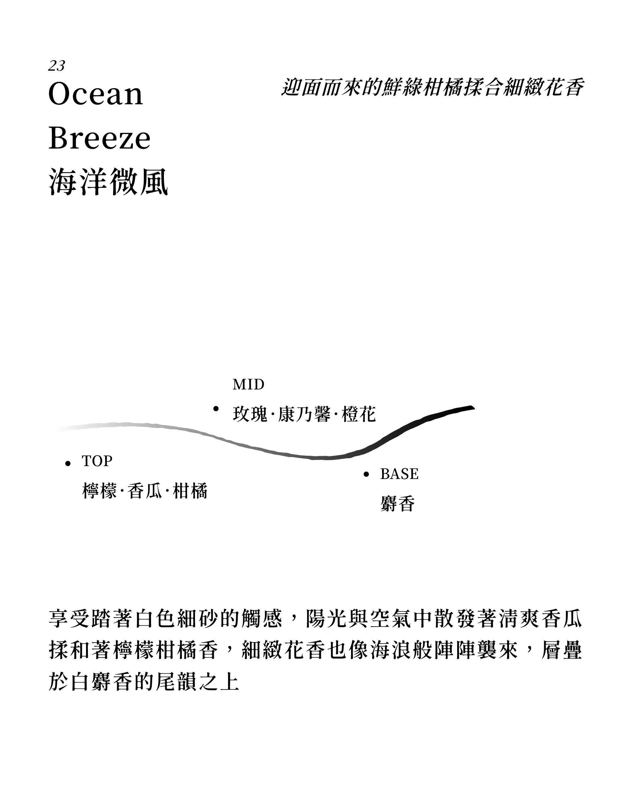Green top notes with fresh floral, citrus, muguet and jasmine. Heart notes of hyacinth, rose, carnation and narcissus. A light musk at the base of the fragrance.