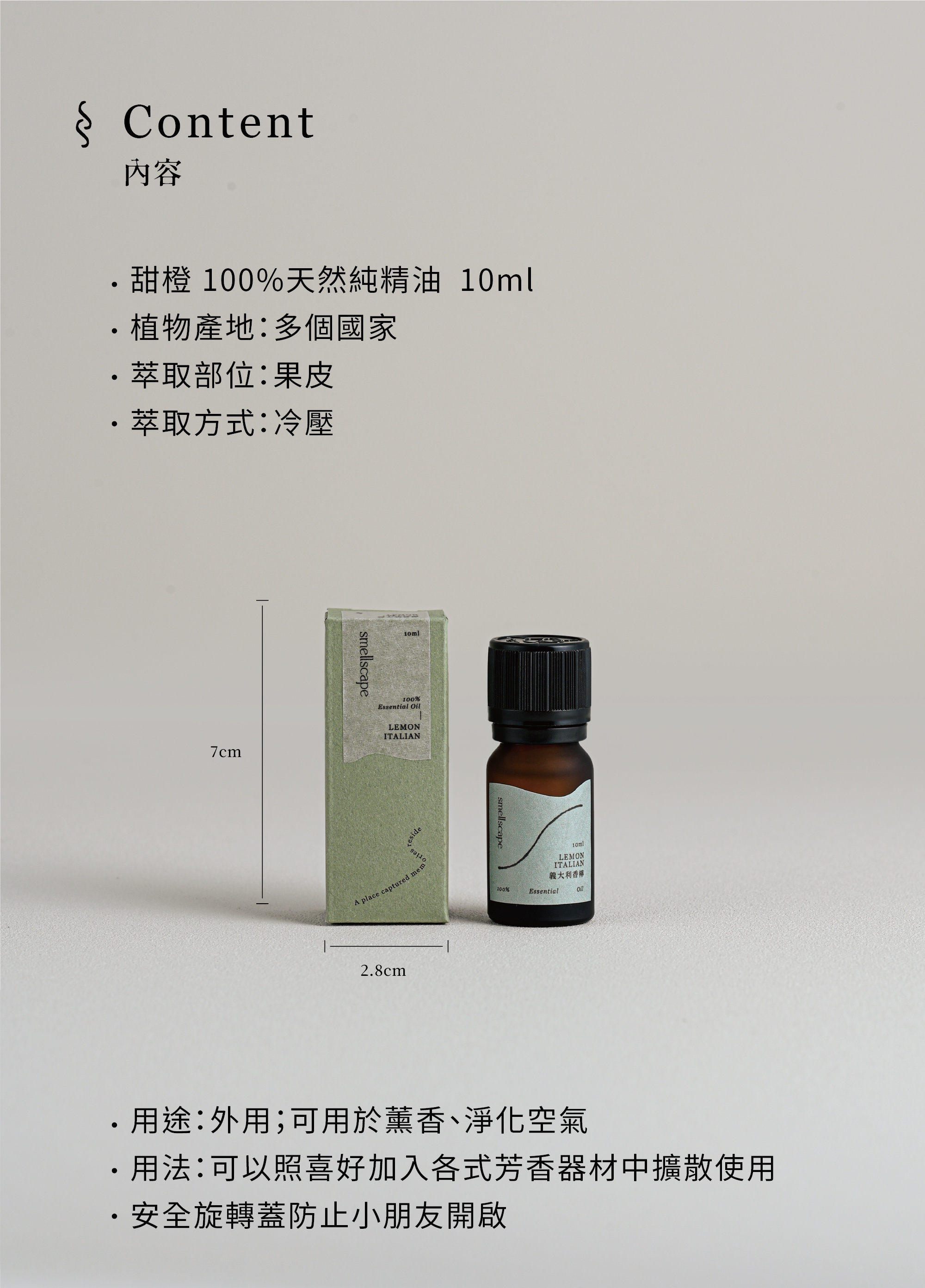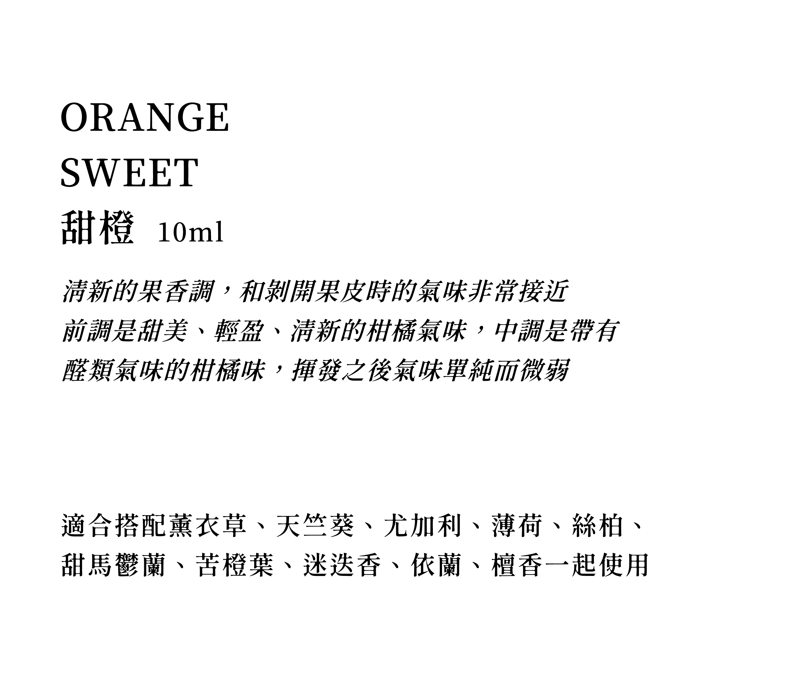 清新的果香調,和剝開果皮時的氣味非常接近,是甜美、輕盈、清新的柑橘氣味。