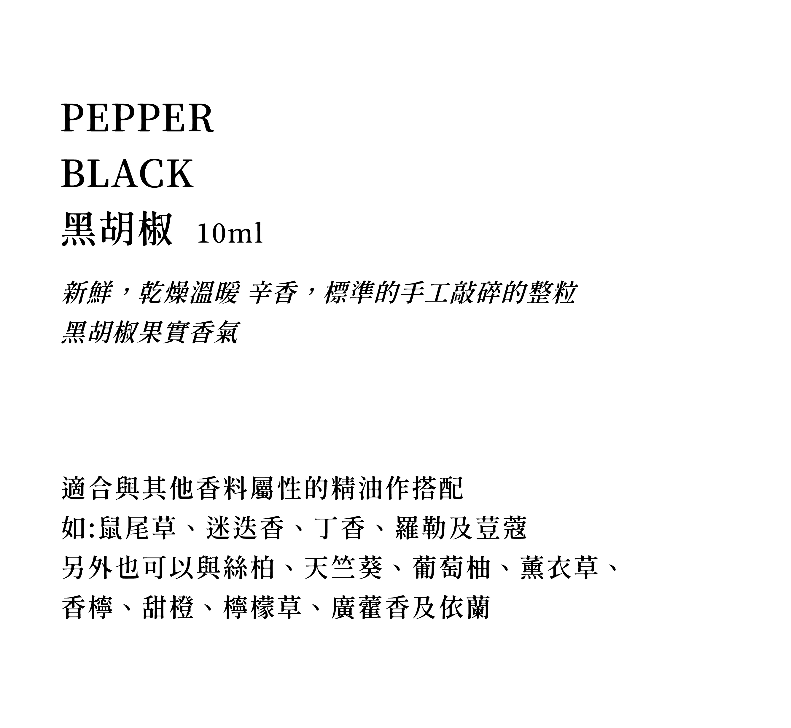 新鮮,乾燥溫暖 辛香,標準的手工敲碎的整粒黑胡椒果實香氣。適合與其他香料屬性的精油作搭配。