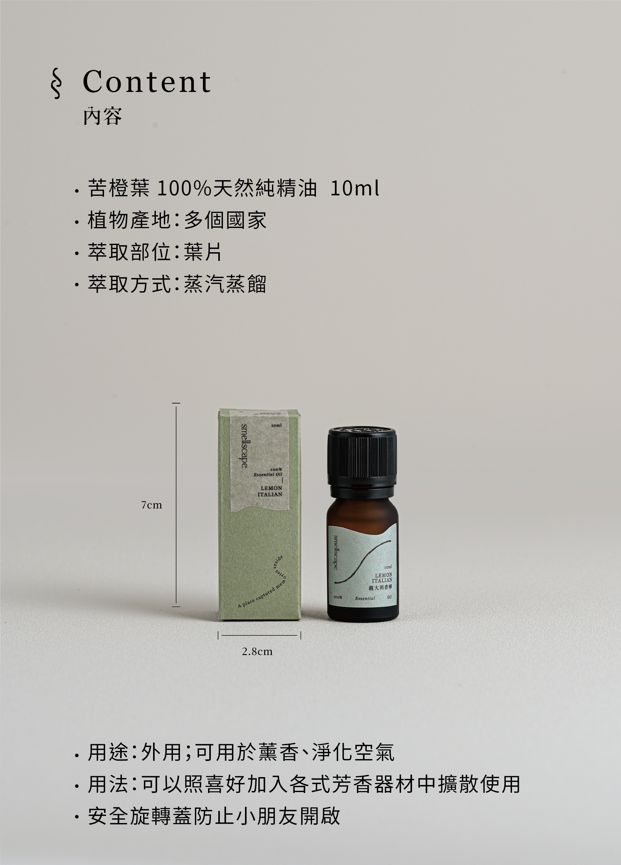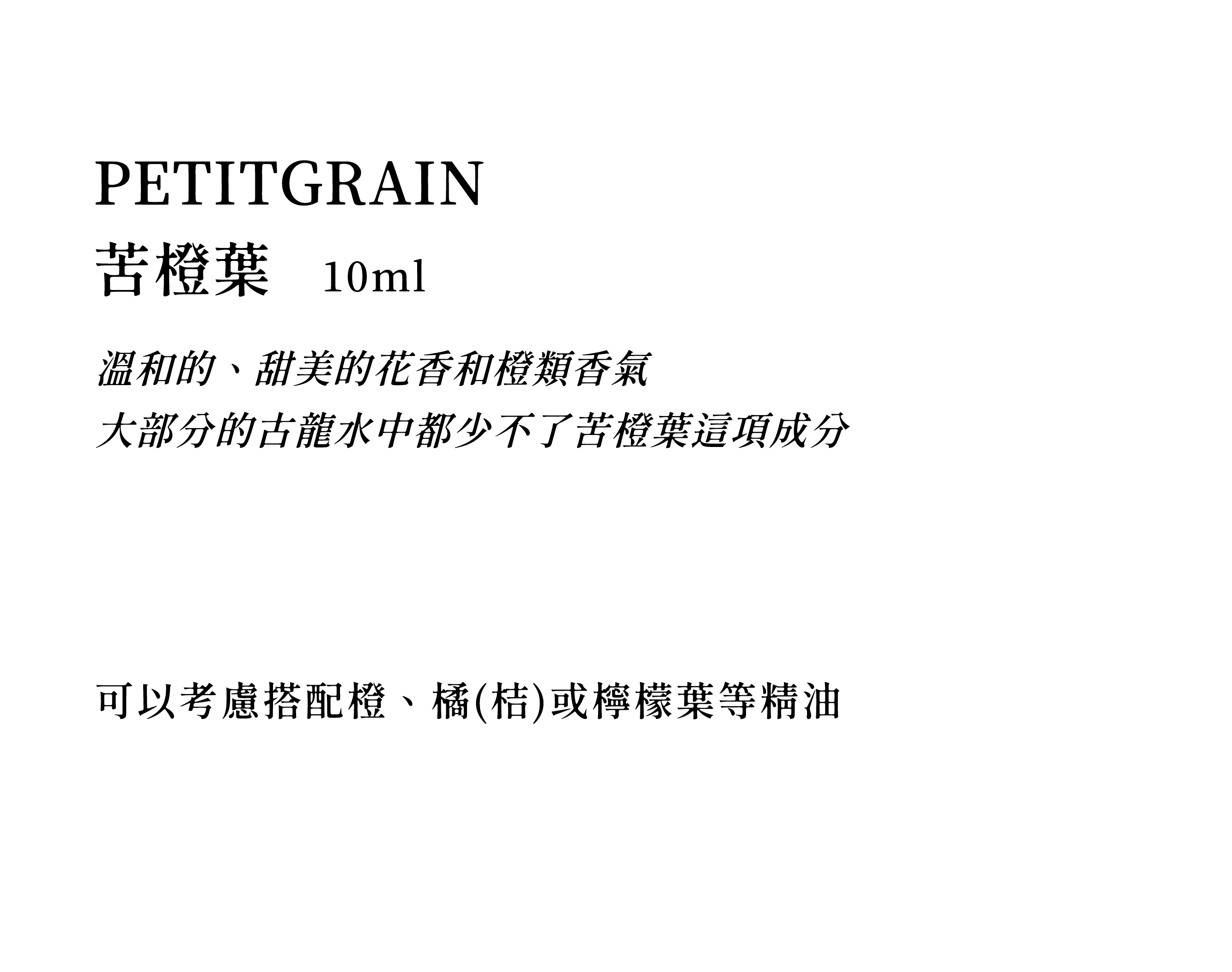 溫和的、甜美的花香和橙類香氣。大部分的古龍水中都少不了苦橙葉這項成分。