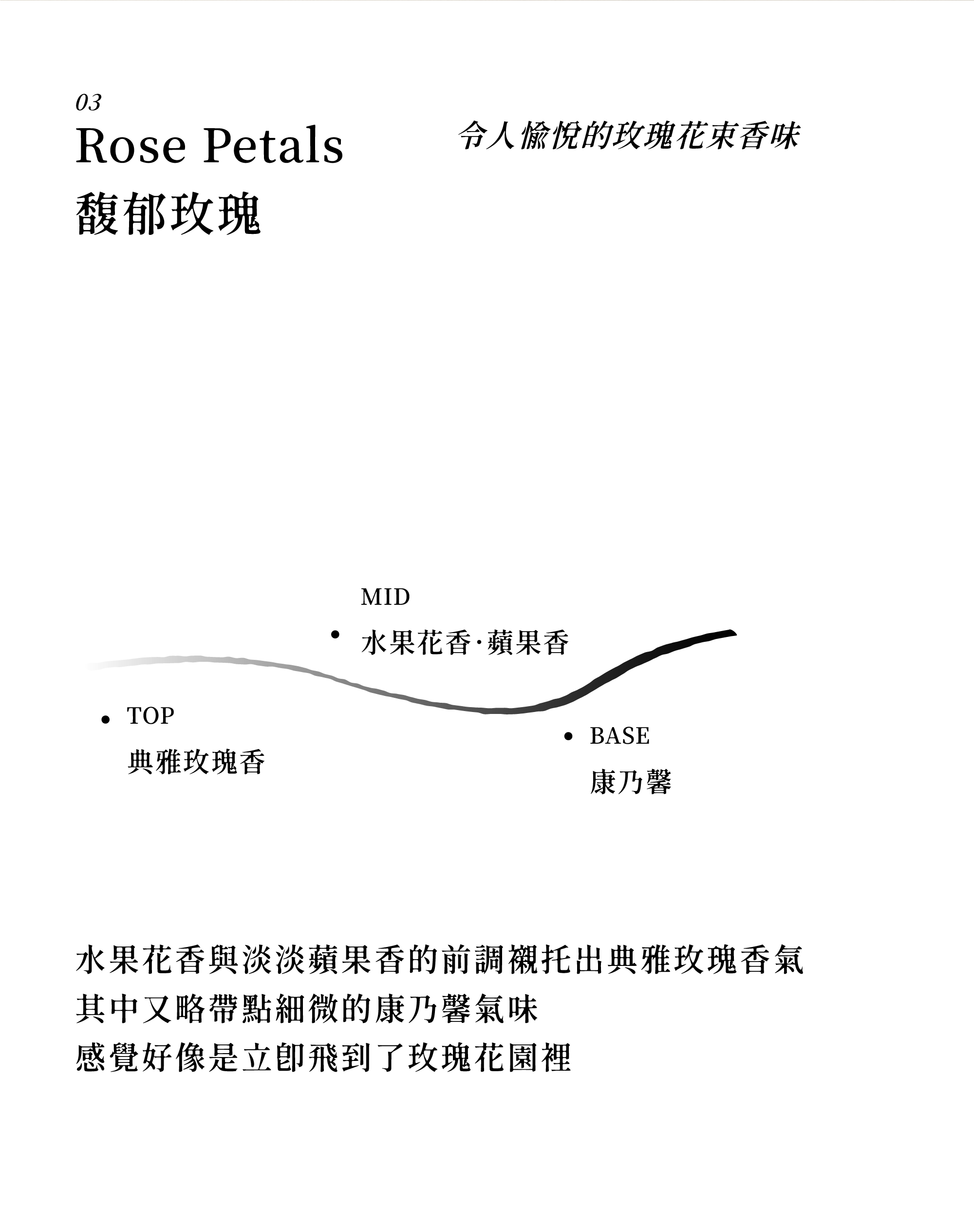 A delightful bouquet of fragrant roses. Top notes of fruity floral apple. The heart of the fragrance is a sumptuous bunch of roses, with nuances of carnation. Base note is a soft lingering musk. This fragrance transports you to an English rose garden.