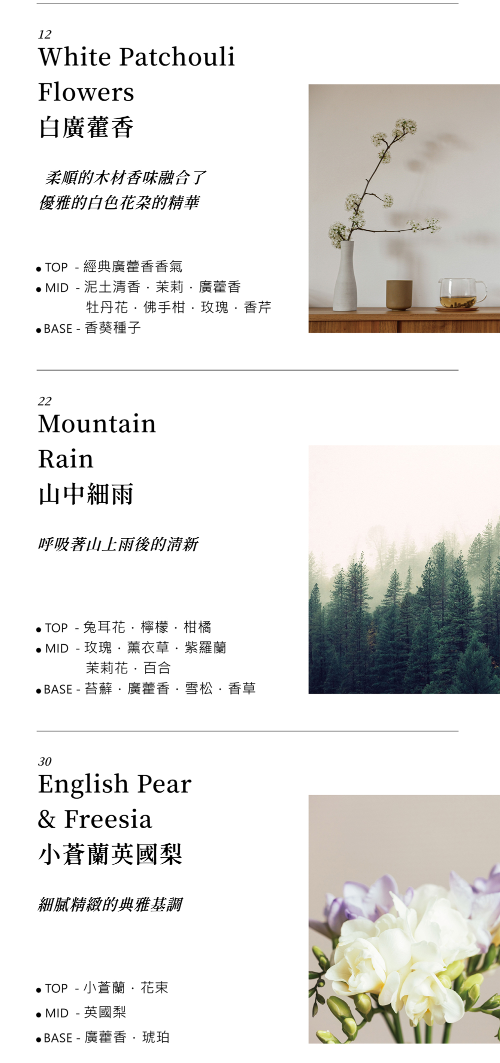 白麝香、山中細雨、白廣藿香、初霽綠茶、小蒼蘭英國梨