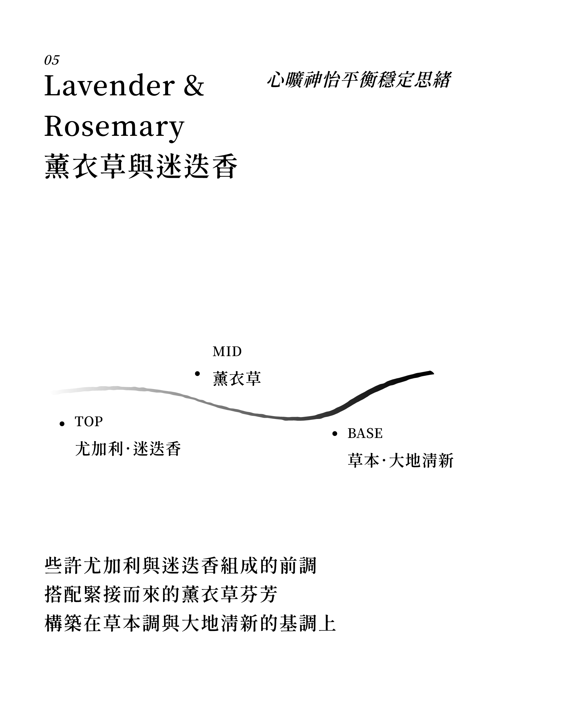 些許尤加利與迷迭香組成的前調,搭配緊接而來的薰衣草芬芳,構築在草本調與大地清新的基調上。